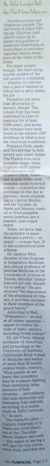 Two Santa Fe chefs — Augusto Delprado of Il Piatto and Ariel Harrison of the Chocolate Maven Bakery and café — also admit to having a soft spot for this curva- ceous fruit, and they are happy to share some of their most popular pumpkin recipes with us.